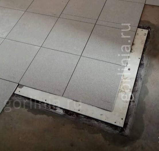 Конструкция смещенного за ось узла шарнира позволяет плиточникам убрать щель над петлей, сохранив при этом важный размер лаза в чистоте 1050х600 для комфортного спуска в подвал.