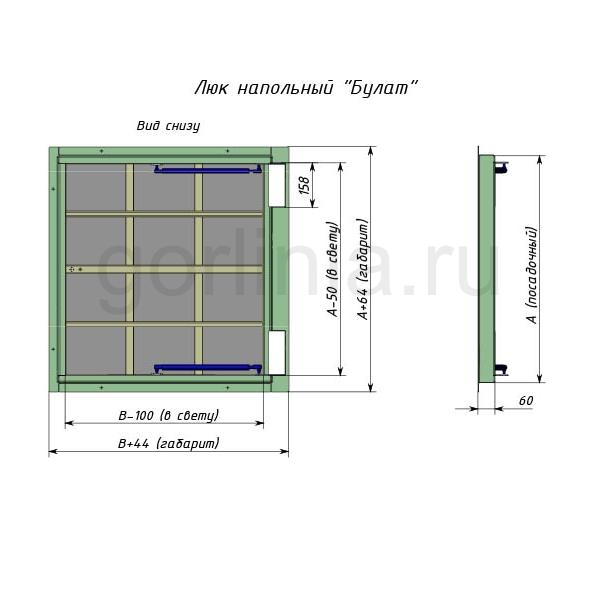 Рама с наличником для установки на напольное отверстие с креплением саморезами по контуру. Крышка ходит на петлях амортизаторами.