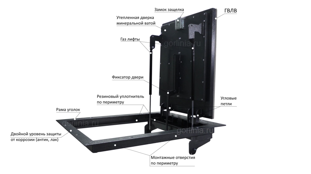 - сравнительно большой вес дверцы поддерживается специальными упорами и механическим фиксатором;