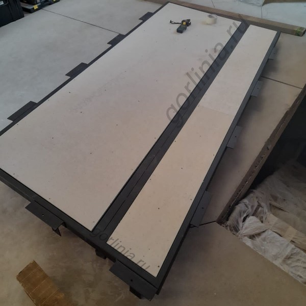 Решающую роль сыграла услуга замера и установки, когда конструкторы получили необходимую информацию и в кооперации с монтажниками разработали проект двухсекционной рамы с продольным "глухарем" со стороны петель и дополнительно примыкающей глухой частью, заполняющей собой оставшийся проем. Замерщик заложил в конструкцию монтажные полосы и посадочные уголки по контуру для удобства крепления коробки, предложил разместить опорные стойки по оси открывания створки.С учетом фактических размеров марша лестницы заказчик согласился уменьшить ширину пролета люка в свету с 1080 до 775 мм, поэтому дверь осталась в размерных допусках для корректной работы актуаторов и догрузов газовыми амортизаторами под вес керамогранита.